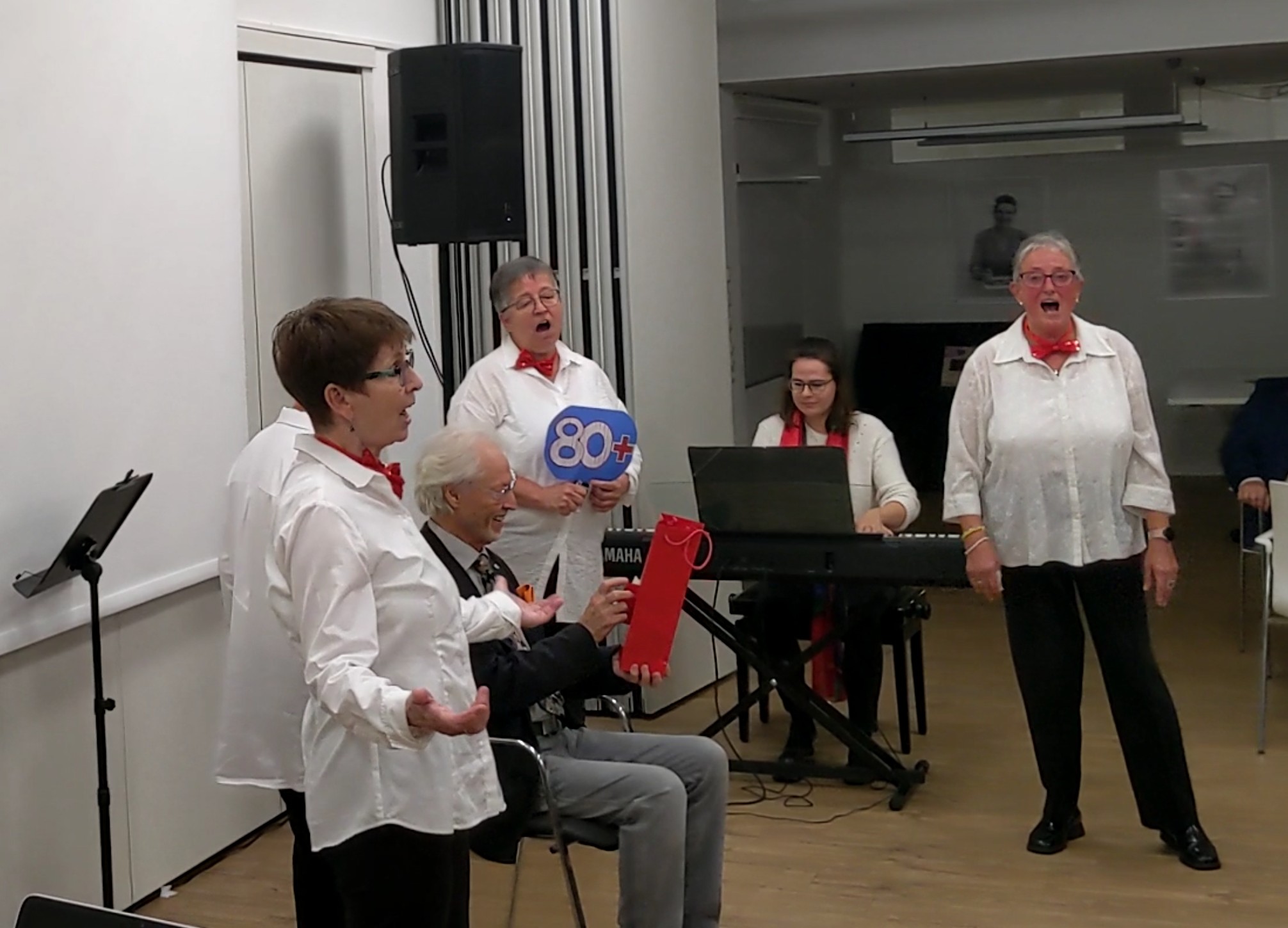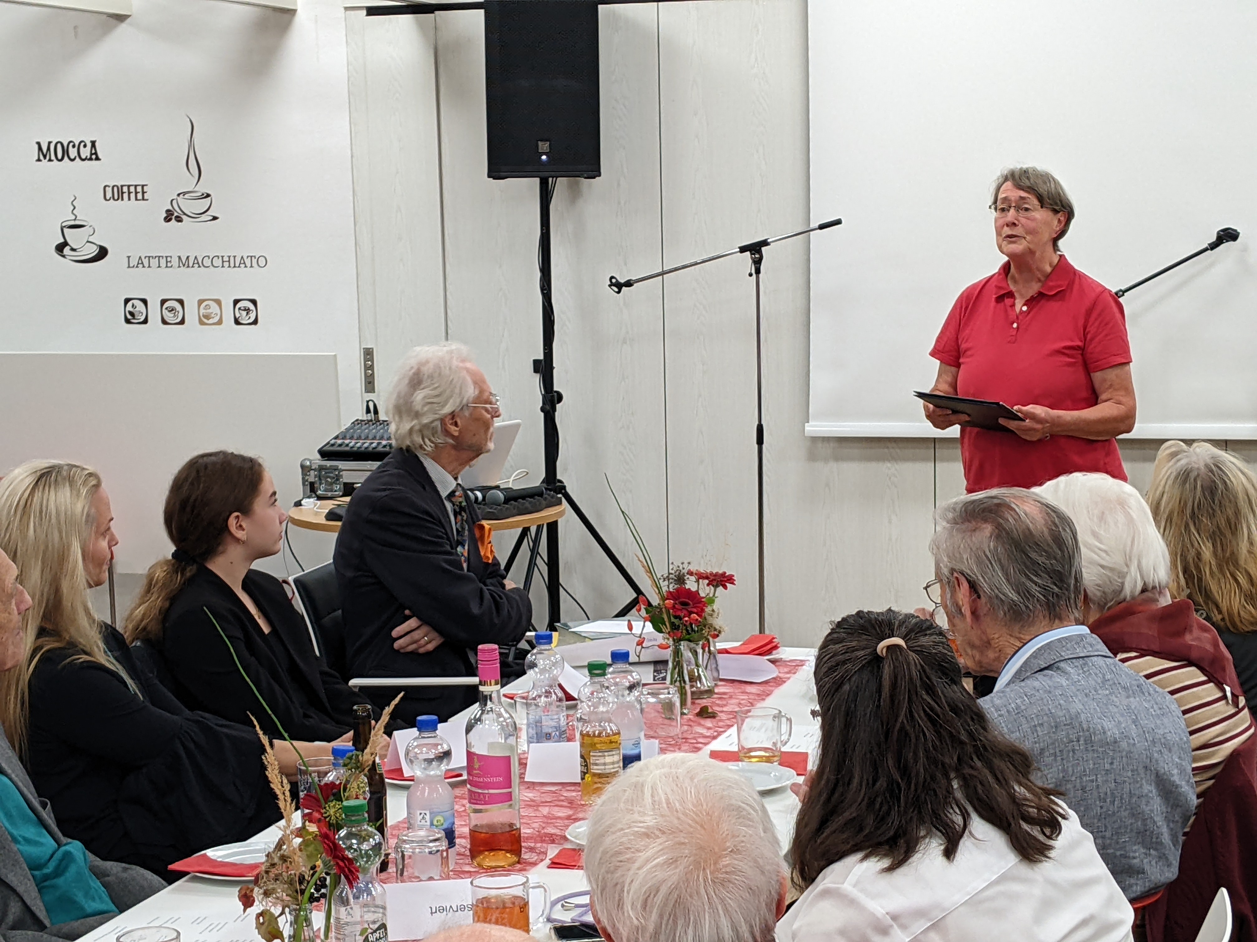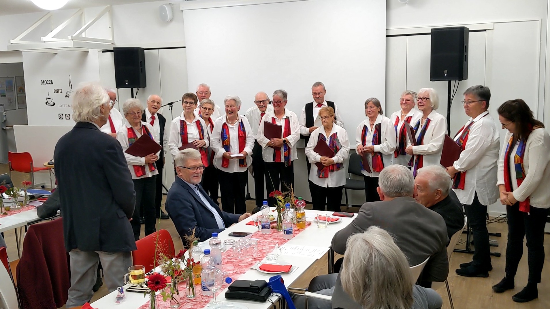 Nach einer kurzen Pause ging Wolfgang Thiedemann in seiner Ansprache auf seine lange Tätigkeit beim Liederkranz Daxlanden ein. Er übergab seiner Nachfolgerin Sabrina Cepreaga einen Notenschlüssel und erzählte einige lustige Anekdoten, bevor er einen Film vorführte, der viele schöne Erinnerungen an diversen Auftritten des Liederkranz wachrief.