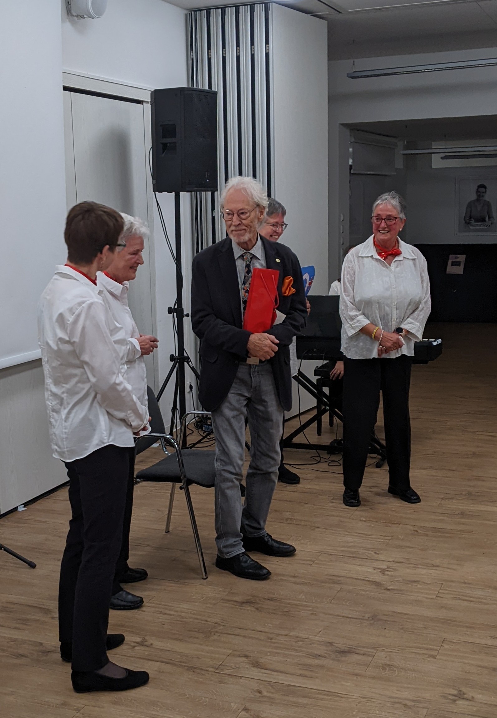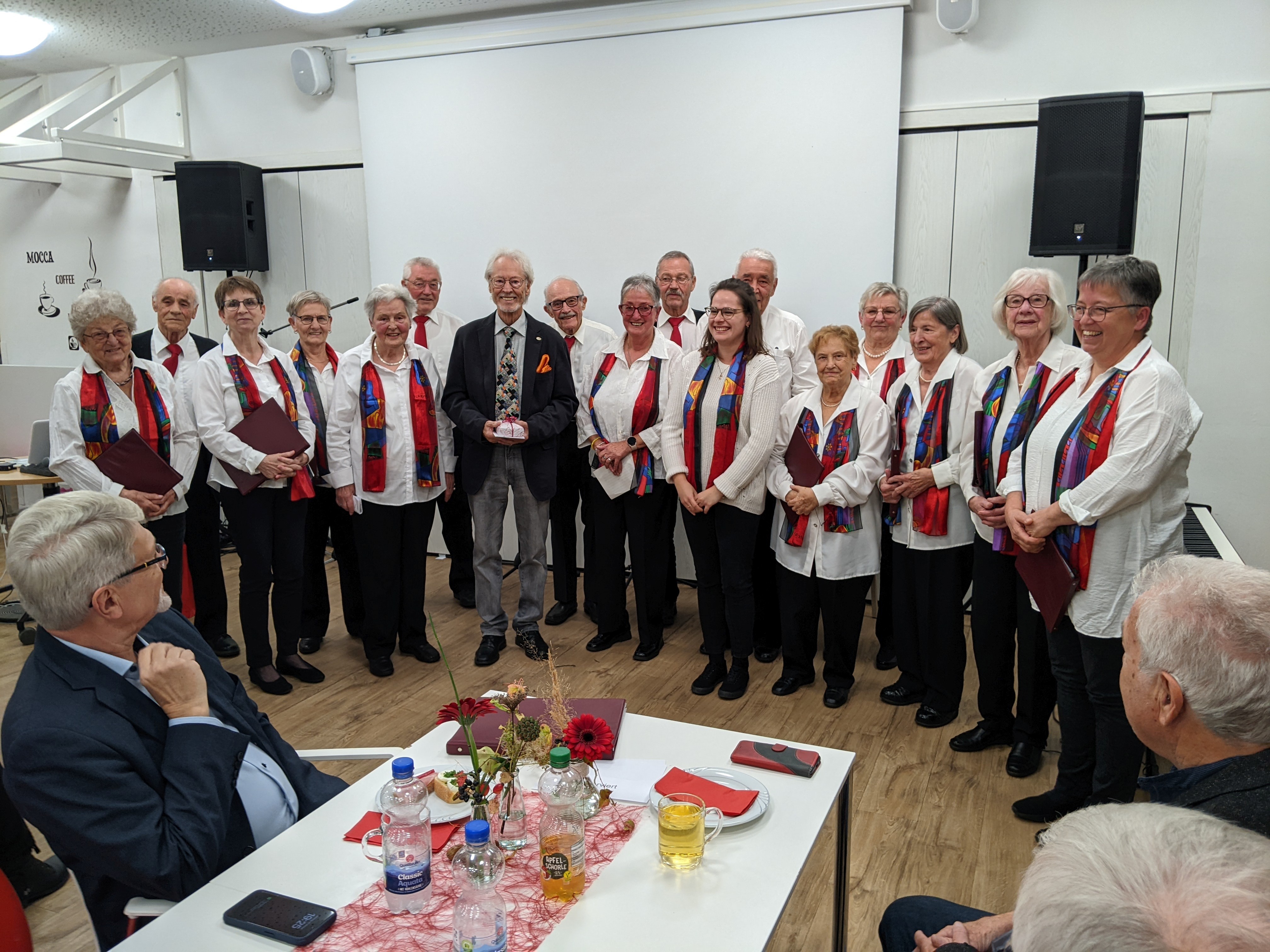 Unser Dirigent Wolfgang Thiedemann hat nach fast 40-jähriger Tätigkeit als Dirigent beim Liederkranz Daxlanden seinen Dirigentenstab niedergelegt. Aus diesem Grund hatte der Liederkranz Daxlanden seine Mitglieder, Freunde und Gönner eingeladen, um sich am 19.10.2024 bei einer feierlichen Veranstaltung von seinem Dirigenten Wolfgang Thiedemann zu verabschieden. Susanne Schulte vom Vorstandsteam des Liederkranz Daxlanden begrüßte die Anwesenden und führte durch das Programm. Nach einem Liedvortrag „Sag beim Abschied leise servus“ durch das Frauenquartett - Gudrun Schuster, Gudrun Heider, Monika Jüngert und Birgitta Maier – und einer Ansprache von Susanne Schulte, die unter anderem die lange Tätigkeit von Wolfgang Thiedemann hervorhob und diesem eine Urkunde mit der Ernennung zum Ehrenchorleiter des Liederkranz Daxlanden übergab, überbrachten der Präsident des Badischen Chorverbands Hort Winter, Raimund Horzel als Ehrenvorstand des Bürgervereins und Horst Kappler als Vorstand des Bürgervereins ihre Grußworte. Knut Maurer, ein langjähriger Weggefährte von Wolfgang Thiedemann, überbrachte musikalische Grüße auf dem E-Piano. Der Gemischte Chor des Liederkranz Daxlanden brachte unter der neuen Dirigentin Sabrina Cepreaga das Lied „Zeit ist ein Geschenk“ zum Vortrag. Vom Chor erhielt Wolfgang als Erinnerungsgeschenk eine Uhr, die nicht nur Datum und Zeit, sondern auch Pulsschlag, Blutdruck und vieles mehr anzeigt. Frau Thiedemann, die vieles für unseren Chor getan hat, nur um ein Beispiel zu nennen, die Übersetzung ausländischer Lieder ins Deutsche, die Wolfgang teilweise für den Liederkranz arrangiert hat, erhielt für ihr Engagement für den Liederkranz Daxlanden einen Blumenstrauß.
